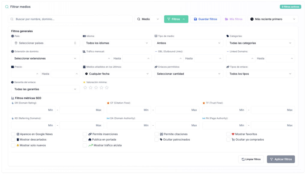 Filtra por tipo de medio, métricas, precios, tipo de enlaces aceptados, garantía, valoración, si marca o no contenido patrocinado, si pasa por portada...