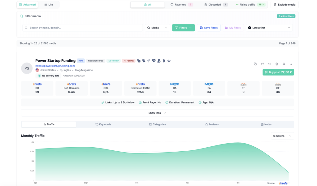 Puedes filtrar entre más de 20.000 periódicos y blogs diferentes por temática, país, precio, número de enlaces, métricas, etc