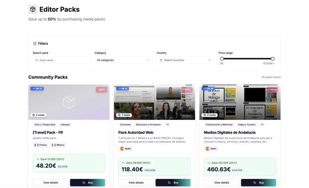 Ahorra hasta un 50% con nuestros packs de enlaces. Combinaciones temáticas, de autoridad o por país, listas para impulsar tu SEO con la mejor relación calidad-precio. Establece tus filtros y echa un vistazo a todos nuestros packs de backlinks.