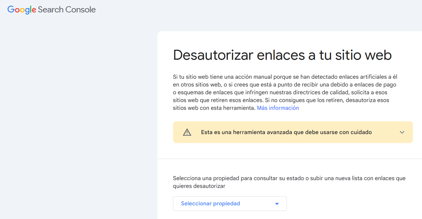 Accede a la herramienta de desautorización de enlaces y selecciona la propiedad correcta. Luego sube el archivo de texto (.txt) que incluya los enlaces o dominos que quieres desautorizar en el formato adecuado y Google procesará la solicitud en varias semanas.