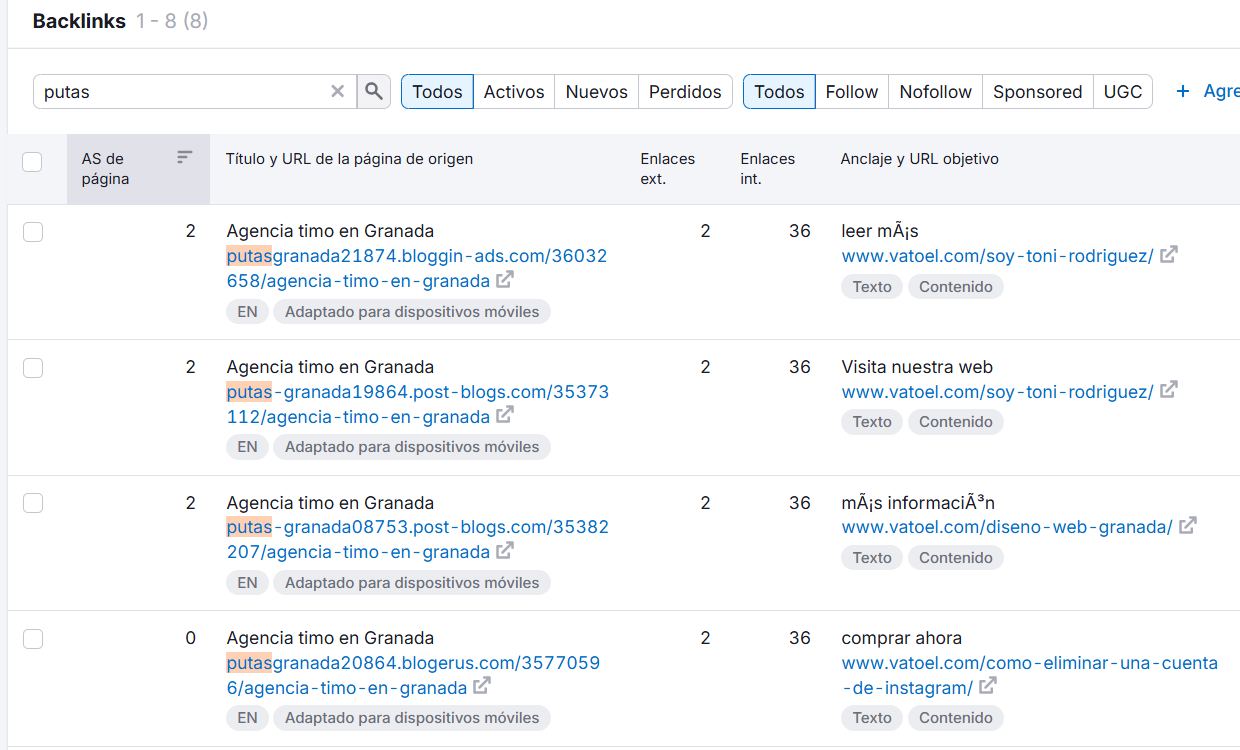– Si tu sitio ha sufrido un ataque de SEO negativo, notarás una bajada del tráfico. Revisa los enlaces y comprueba que efectivamente son enlaces dañinos (que alguien que te quiere mucho te ha puesto)