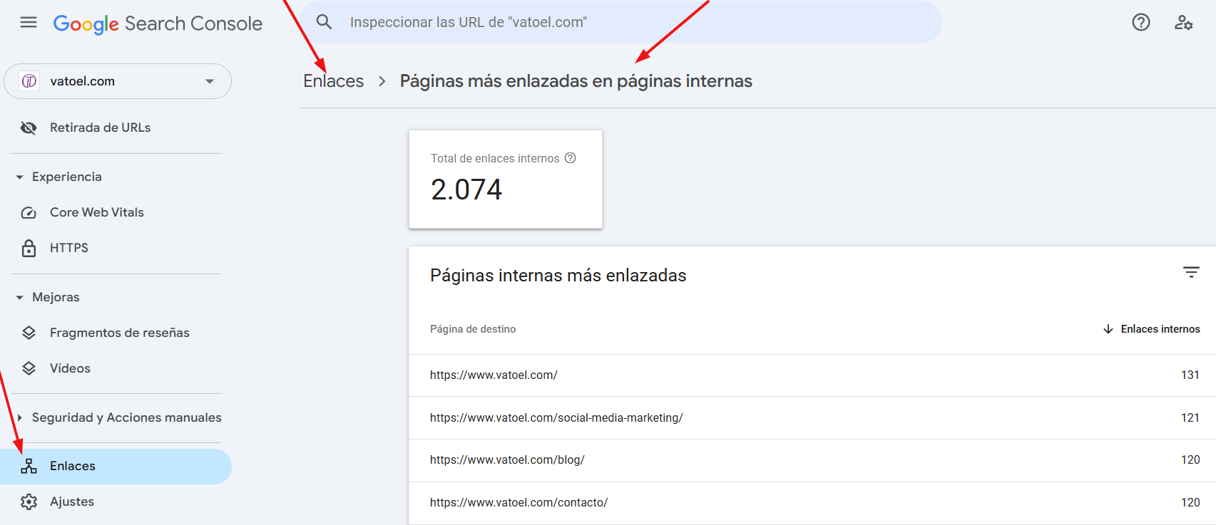 Solo tienes que entrar en tu cuenta, ir a la sección “Enlaces” y luego a “Enlaces internos“. Ahí verás un listado de las páginas más enlazadas dentro de tu sitio, y al hacer clic en cada una, podrás ver desde qué URLs se han enlazado.